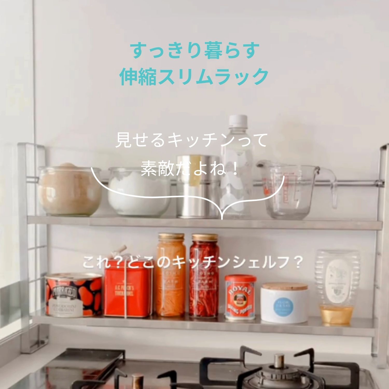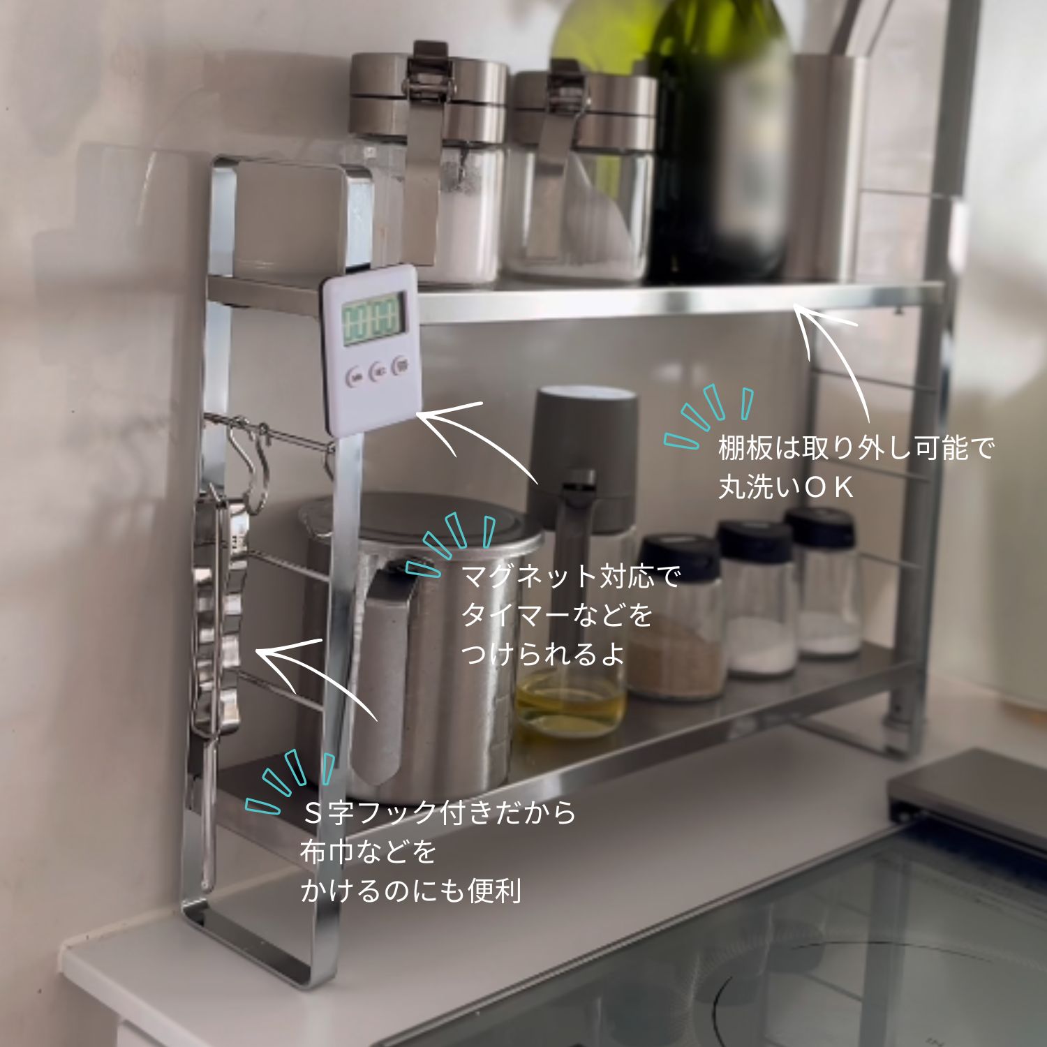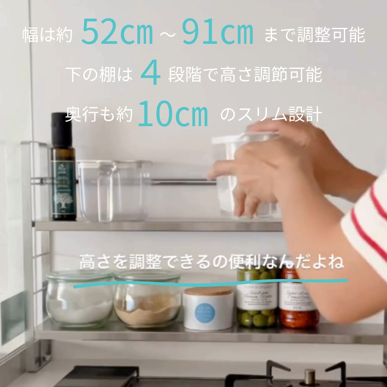また下の棚は4段階で移動できるので、調味料や瓶の高さに合わせてお好みで調整可能。