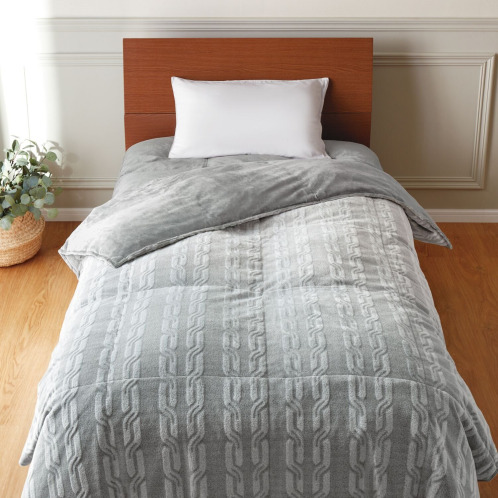 側地は両面起毛のマイクロファイバーの上質な毛布地で、身体側の毛布地の基布には吸湿発熱素材を使用しました。
