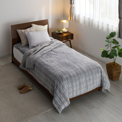 シックな柄の暖かな羽毛ふとんは、寝室をおしゃれに彩ります。