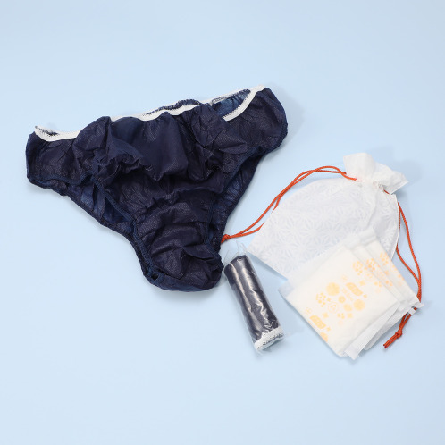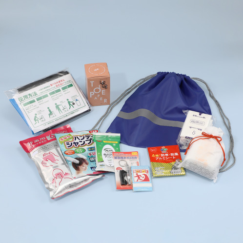 ・不織布ショーツ×2(巾着袋内)、吸水ライナー×3(巾着袋内)、巾着袋、尿取りパッド×3、ホイッスル 、アルミ保温シート、巾着リュック、LogLog(70m巻トイレットペーパー)、トイレ処理セット(15 回分)、ウェットタオル、防災ガイド、歯みがきティシュ(10枚入)、水のいらない手袋型ハンディシャンプ ー(2枚入)