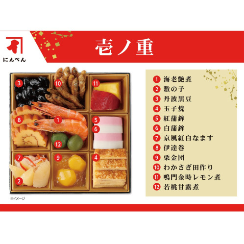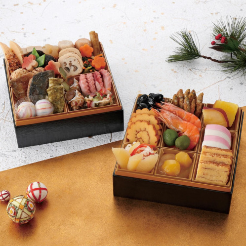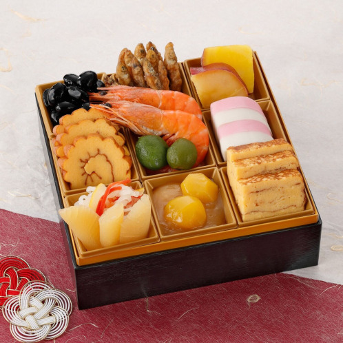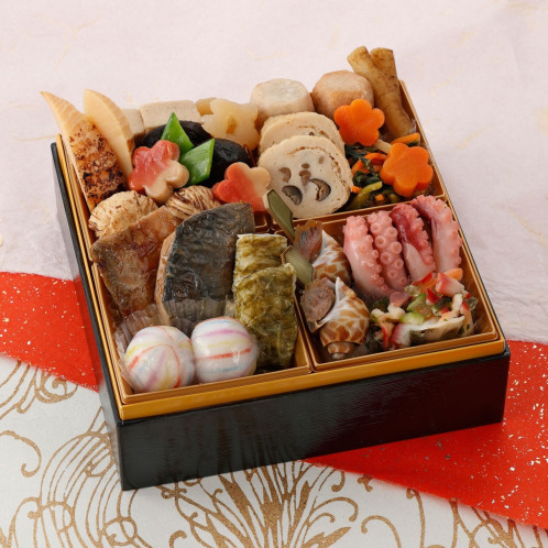 重箱に盛り付けてあり、“ハレの日”の祝い膳を豪華に彩ります。