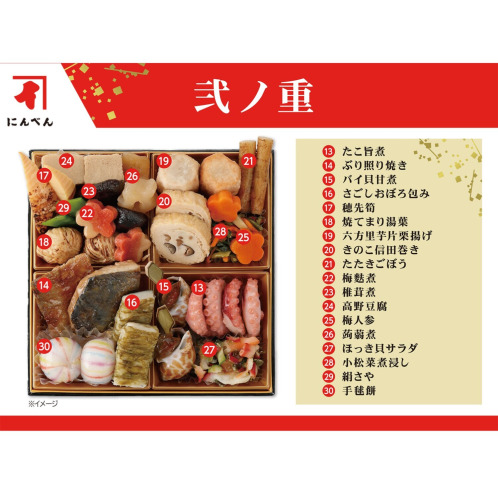 がつくる、日本の伝統食であるだしをベースに仕上げたおせち料理を彩り豊かに30品目ちりばめました。