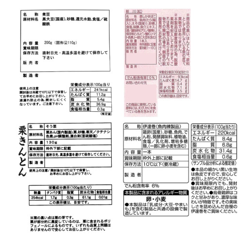 ・伊達巻(烏骨鶏卵使用):本製品は「乳成分」を含む製品と共通の設備で製造しています。