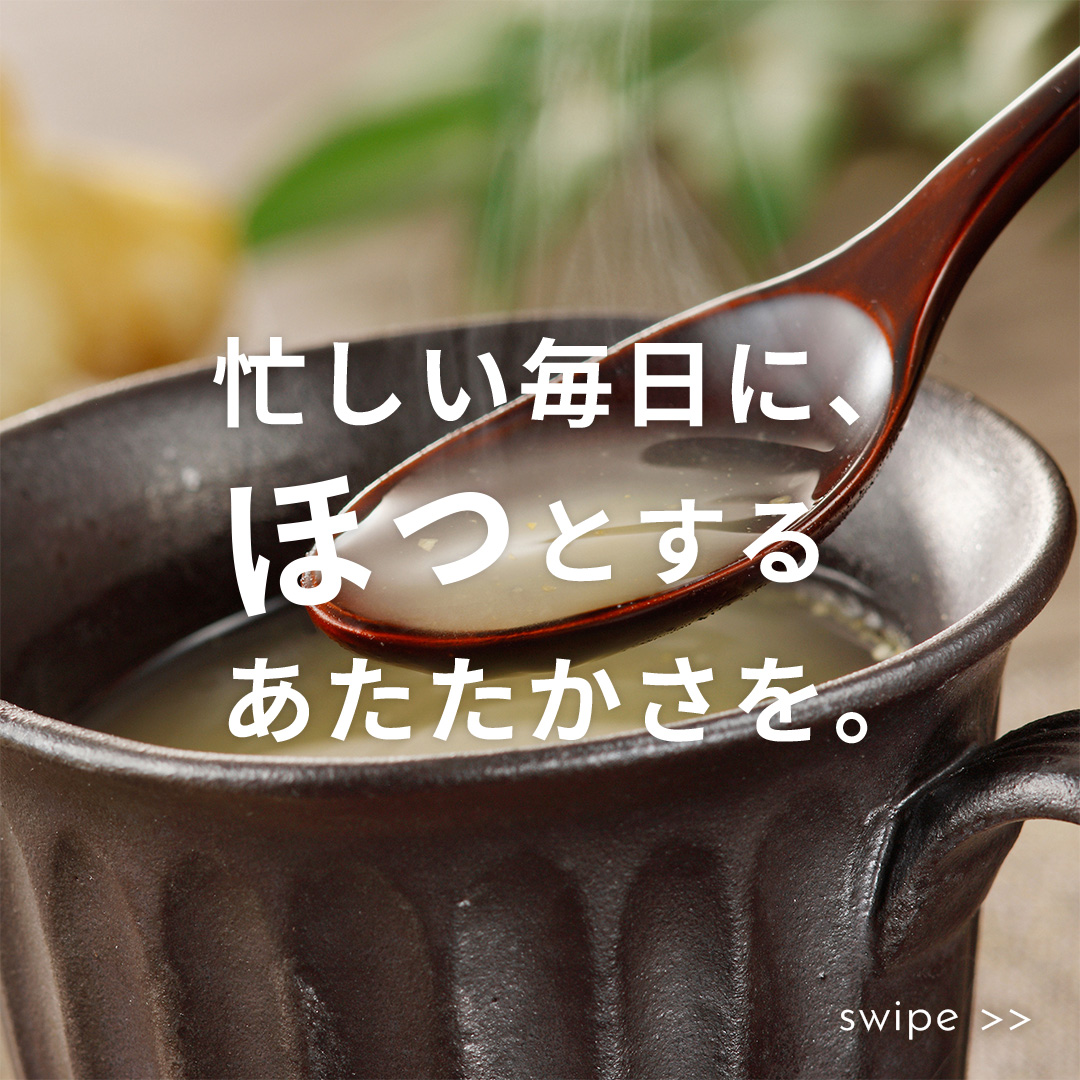 口当たりの良い甘みの中に、コクのある豊かな生姜の風味が広がるおいしい生姜湯です。
