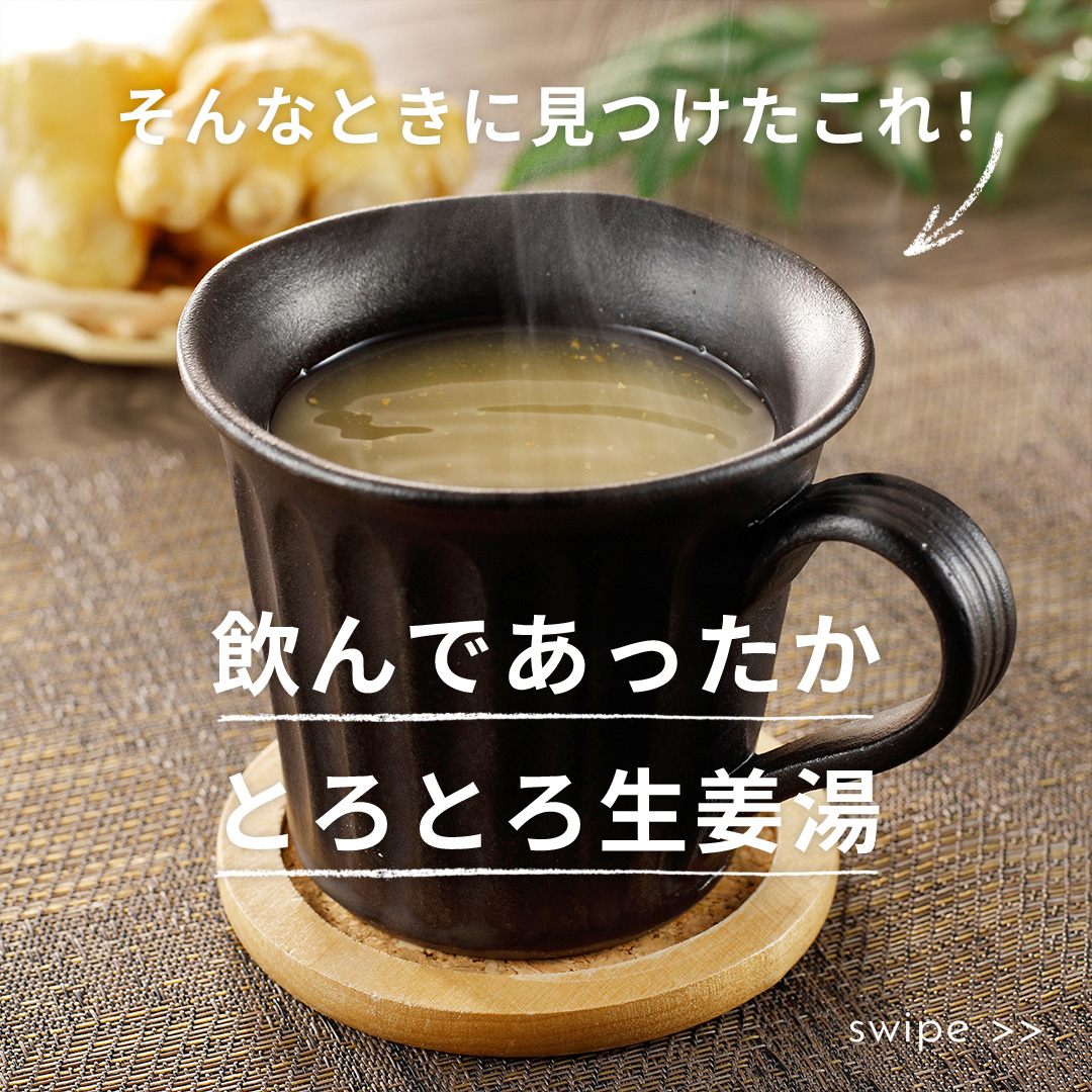 生姜を知り尽くしたプロが、蒸した生姜と、生の生姜の2種類を使い、すべて国産の原料にこだわって作り上げた「生姜湯」のご紹介です。