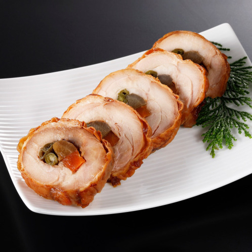 国産の鶏もも肉で、彩りの良い国産野菜(いんげん・にんじん・ごぼう)を巻いて、しっとりやわらかく仕上げました。
