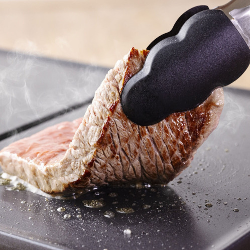 ダイヤルには食材ごとの調理温度の目安が5個番号表示されているので、食材ごとの適した火入れ温度で2面同時調理ができます。