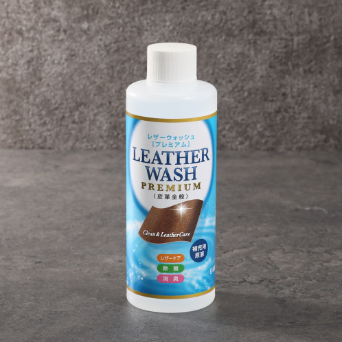 革製品に水はタブーという常識を覆した、家庭で洗える皮革専用の栄養洗剤レザーウォッシュプレミアムから、スプレータイプの詰め替えに便利な濃縮原液ボトルをご用意しました。