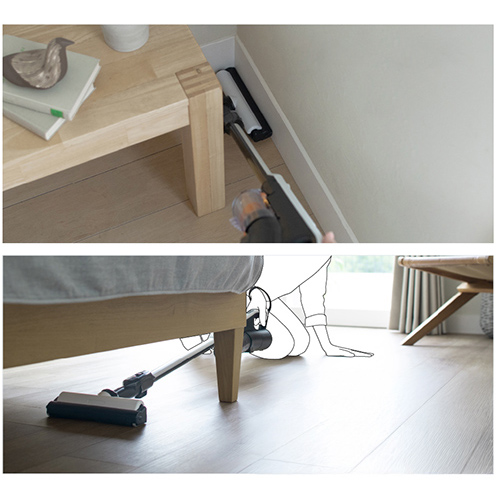 回転ブラシをヘッドの前側に近づけて配置することで、壁ぎわのごみもすっきり取り除きます。