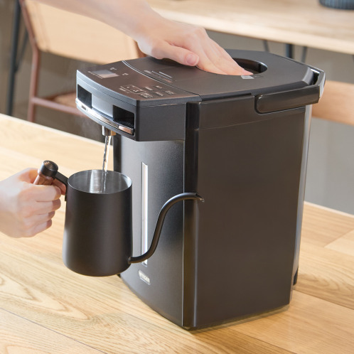 電気で沸かしてまほうびんで保温する!シンプルでスタイリッシュなスクエアフォルムが特徴の蒸気レスタイプの電気ポット“とく子さん”のご紹介です。