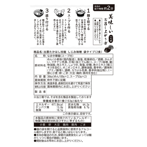 老舗製麺所 素材のこだわりが光る 出雲ラーメン (しじみだし味噌味)