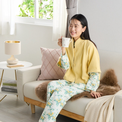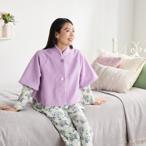 背当てと袖口見返しに花柄プリントを使用し、袖から見えるパジャマとのコーディネートも楽しめます。