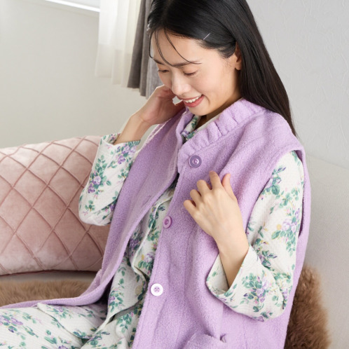 寒さが気になる背中から腰回りを覆ってくれ、えりを施しているため首元まであたたかなデザインで、さらに留めやすい大きめサイズのボタンを使用しているため、着脱もしやすいこだわりの仕様です。