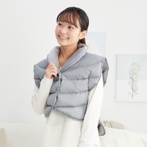 睡眠時はもちろんアウターとしても活躍する暖かショルダーダウンです。