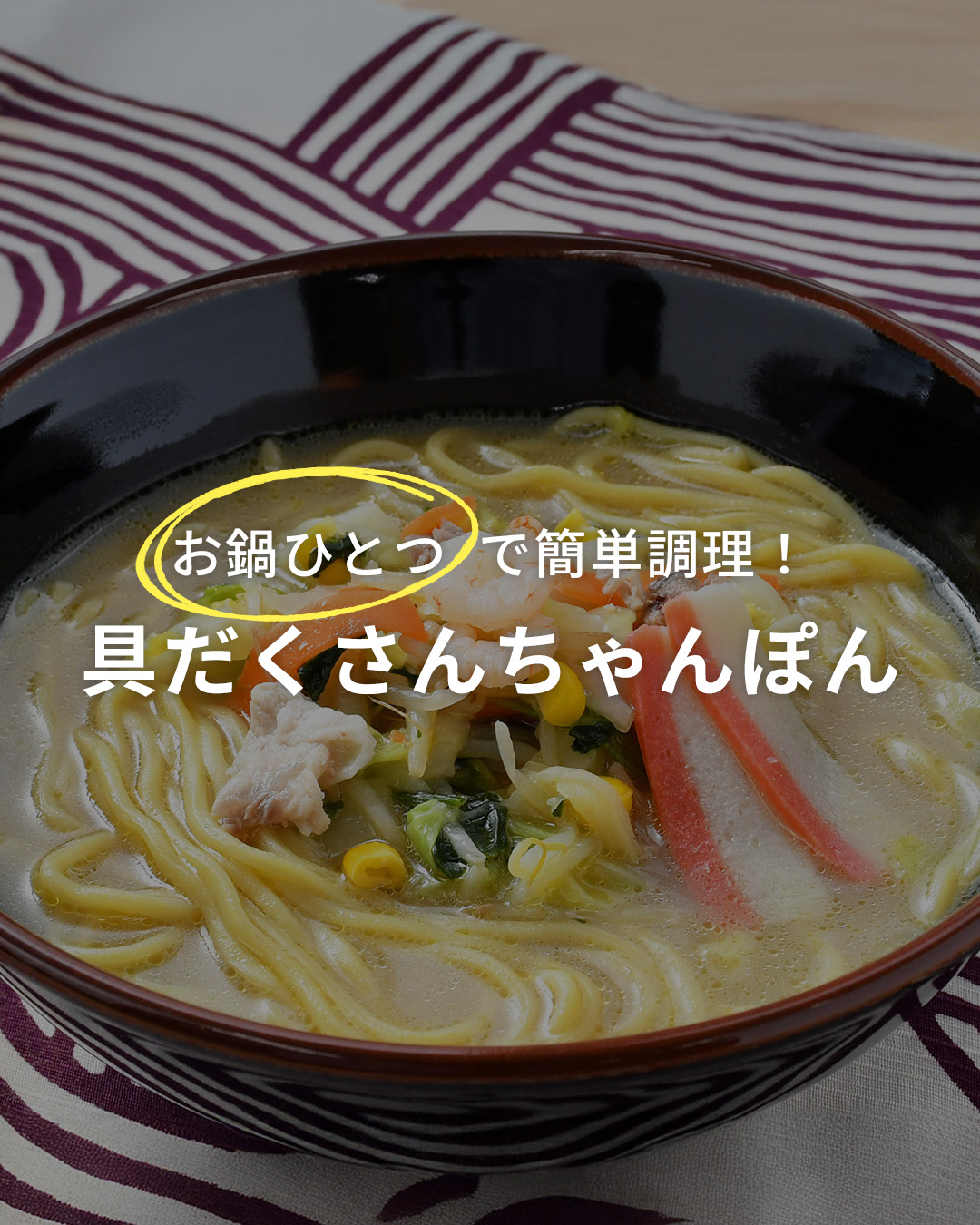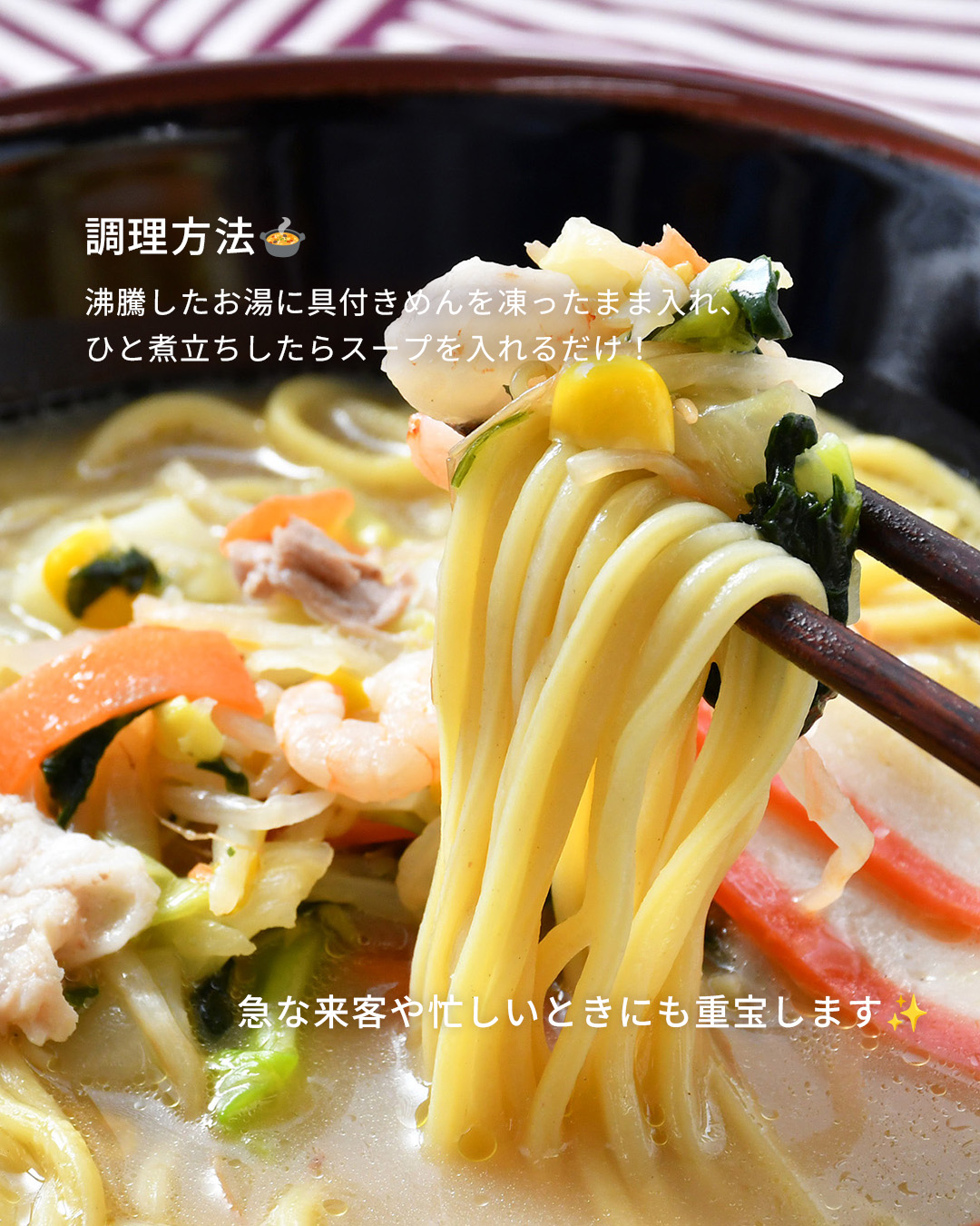 鍋一つで簡単に作れるこだわりのちゃんぽんのご紹介です。弾力とコシがあり、スープの絡みが良いちゃんぽん麺に、10種類の具材(キャベツ、白菜、玉ねぎ、にんじん、もやし、ほうれん草、コーン、豚肉、海老、紅白かまぼこ)をボリュームたっぷりに入れました。スープはちゃんぽんの本場・九州のスープメーカーと共同開発し、作り上げた専用スープ。豚骨などから抽出した“ポークエキス”をベースに、牡蠣・ホタテのエキスなどを加え、まろやかでやさしい味わいとコクがある香りの良い仕上がりです。ご家庭で調理することで、具材の旨みがスープと合わさり、麺とのバランスが絶妙なちゃんぽんをお召し上がりいただけます。