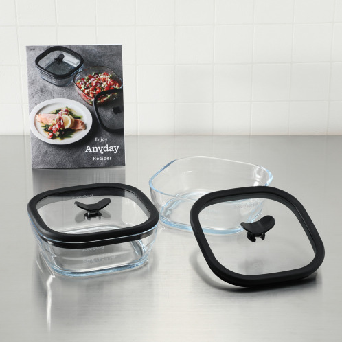 スクエアサイズ& 透明ガラス初採用で 電子レンジのパワーを 最大限活かす! 保存もできる調理器具 マイヤー エニデイシースルー 2個セット ブラック