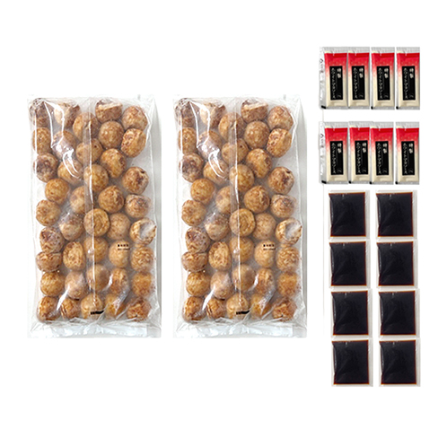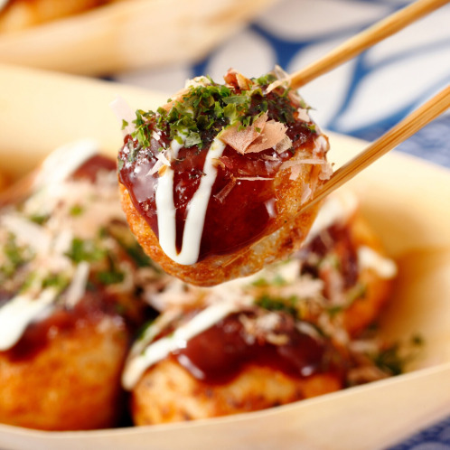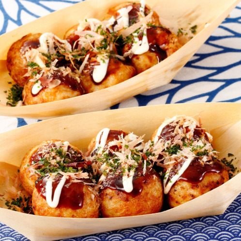 生地に出汁の旨みがたっぷり感じられる、ふんわり焼き上げたたこ焼と、相性抜群の濃厚ソース、ホワイトマヨソースをセットにしてお届け。