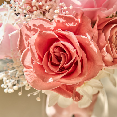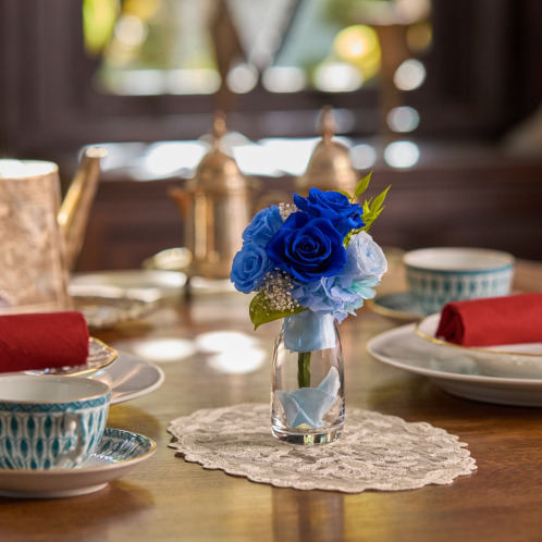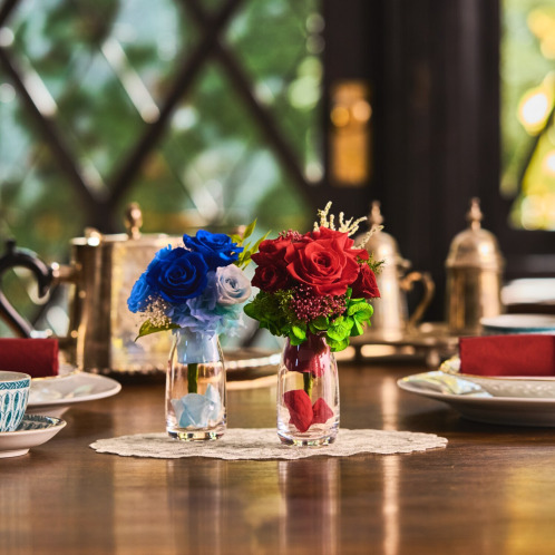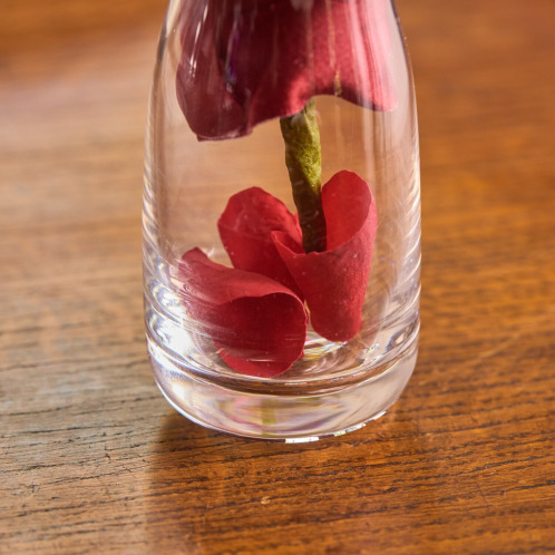 ガラスの花瓶の中には花びらを閉じ込めて、アレンジとのコンビネーションも楽しんで頂けます。