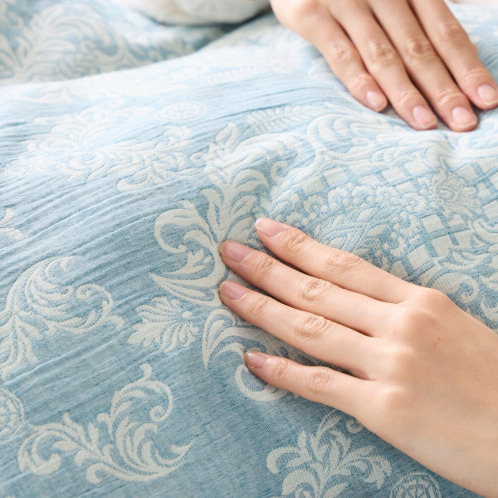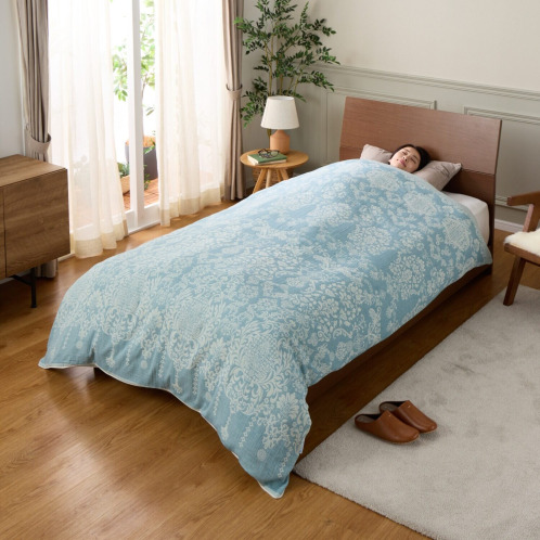 細番手の綿糸を用いた二重ガーゼのジャガード織が、まるで手刺しゅうのような立体感と繊細さを表現。