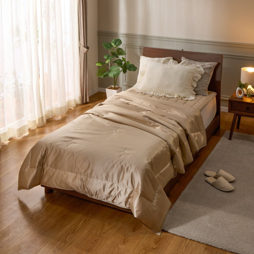 <快眠博士>“シルクスキン”シリーズよりプレミアムラインの肌掛け。空気をたっぷり含むシルク側地と、軽くてあたたかな“アイダーフィール”中わたを組み合わせることで、一年を通して気持ちよくお使いいただける寝具に仕上がりました。