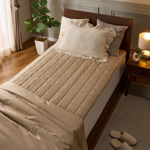 <快眠博士>“シルクスキン”シリーズよりプレミアムラインの敷きパッド。さらりとした肌触りのシルク側地と、程良い弾力性の二層構造中わたを組み合わせることで、ラグジュアリーな寝心地の寝具に仕上がりました。