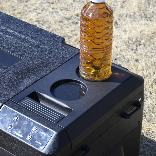 本体上部にドリンクホルダー(2本分)付きで、ふた横のポケットに小物や電源コード類を収納することができます。