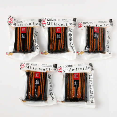 天然紅鮭を北海道産長昆布でミルフィーユ状に巻いた、見た目もきれいな昆布巻きのご紹介です。