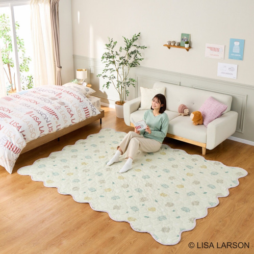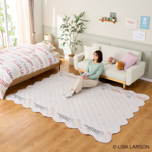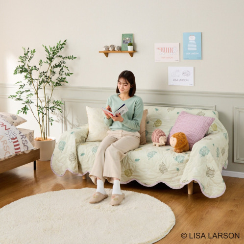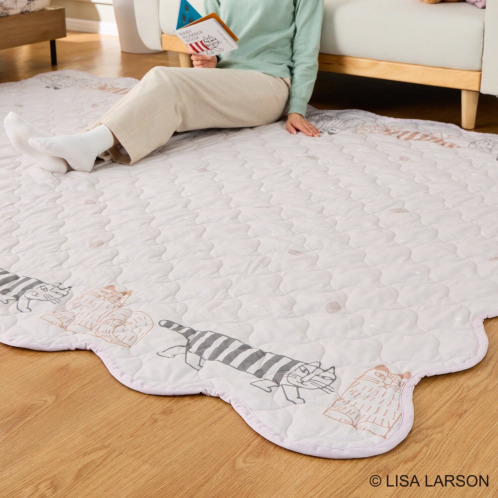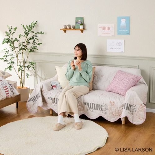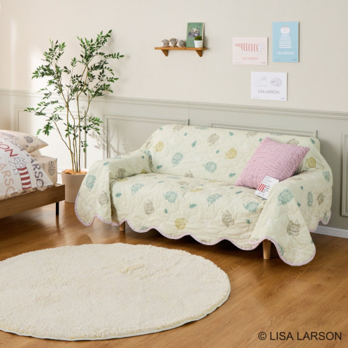 スウェーデンを代表する陶芸家、デザイナーの“リサ・ラーソン”コラボレーションデザインが目をひく、マルチキルトカバーです。ラグ、ソファーカバー、寝具のアクセントカバー、大判のブランケットとしてなど多彩に活躍する優れもの。表側は上質なコットン100%生地、裏側は肌触りの良いピーチスキン加工をほどこしたポリエステル生地を使用しています。表裏で、素材もデザインも異なるリバーシブル仕様なので、その日の気分で使い分けてお楽しみいただけます。中わた入りなのでふんわりとした使い心地もうれしいポイント。洗濯機で丸洗い(ネット使用)できるので、清潔に使えます。
