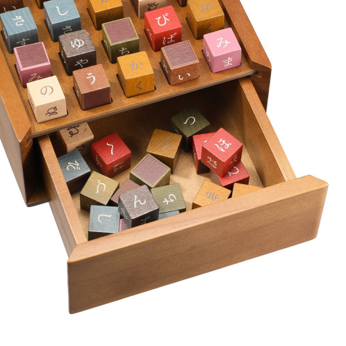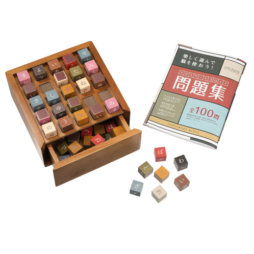 目で平仮名を探し、指先でコマを動かす筆記具不要のクロスワードブロックです。文字コマは、FSC認証を受けた天然木を使用し、やさしく温かみがある手触り。色は落ち着いたアースカラーでインテリアと馴染みます。ボードには収納用の引き出しが内蔵され、持ち運びも簡単です。付属の問題集は難易度3段階、全100問を収録しています。初心者から上級者まで、おひとりでも複数人でも楽しんでいただけます。