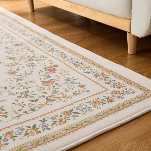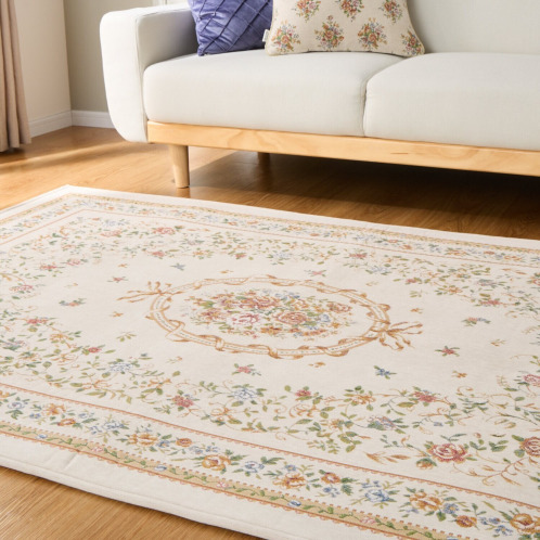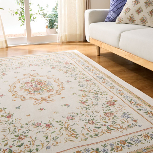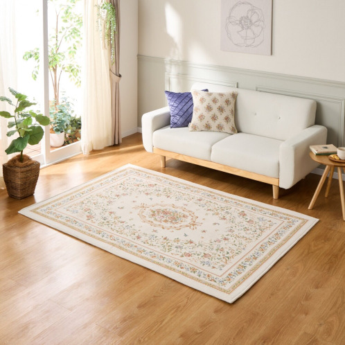 18世紀フランスに起源を持つ、シェニールゴブラン織の技法を用いてお作りしたカーペット。ベルベットのように柔らかくふさふさした手触りが特徴で、光の当たり方や角度によって色の濃淡が変化し、豊かな表情をお楽しみいただけます。和室にも洋室にもなじむ、チャーミングで上品なデザインに仕上げました。中材にウレタンフォームを挟んだ3層構造で、ふっくらとした踏み心地で、底付き感も軽減。裏面は滑りにくい仕様で、掃除機をかける時などにズレにくく使いやすい工夫をほどこしています。また裏側不織布には防ダニ加工、表側にははっ水加工をほどこすなどうれしい機能も満載です。軽量なつくりで、ご家庭の洗濯機でも洗えます。使わないときは折りたたんでコンパクトに収納することも可能。実用性と美しさを兼ね備えた優秀な一品です。