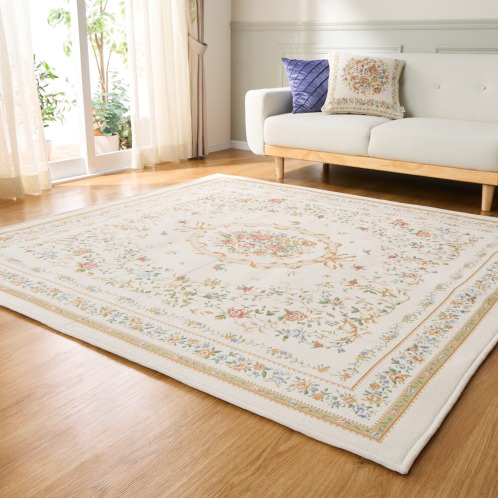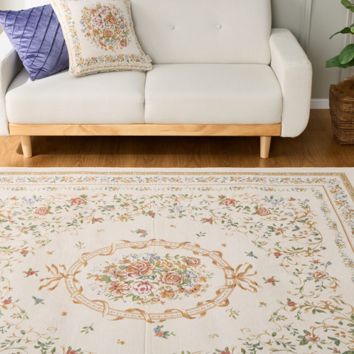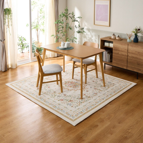 18世紀フランスに起源を持つ、シェニールゴブラン織の技法を用いてお作りしたカーペット。ベルベットのように柔らかくふさふさした手触りが特徴で、光の当たり方や角度によって色の濃淡が変化し、豊かな表情をお楽しみいただけます。和室にも洋室にもなじむ、チャーミングで上品なデザインに仕上げました。中材にウレタンフォームを挟んだ3層構造で、ふっくらとした踏み心地で、底付き感も軽減。裏面は滑りにくい仕様で、掃除機をかける時などにズレにくく使いやすい工夫をほどこしています。また裏側不織布には防ダニ加工、表側にははっ水加工をほどこすなどうれしい機能も満載です。軽量なつくりで、ご家庭の洗濯機でも洗えます。使わないときは折りたたんでコンパクトに収納することも可能。実用性と美しさを兼ね備えた優秀な一品です。