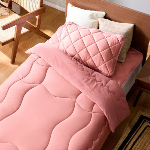 暑い時期にも寒い時期にも快適な使い心地を目指した、サーモアジャストII肌掛けふとん。快適さの秘密は、スーパー調温素材“サーモアジャスト”。全体的に温度調整力が発揮できるよう側地と詰め物に使用しています。詰め物の中層には吸放湿性と消臭(アンモニア、酢酸)機能のある“モイストキャッチャー”を使用し、気になる湿気やニオイ対策にも配慮。詰め物の上層と下層には“テイジン”の防ダニ&抗菌防臭わた“マイティトップII”を使用。側地表側は極細のマイクロファイバーを使い、微起毛加工をほどこすことにより、とろとろとした贅沢な掛け心地、裏側はコットン混のパイルを使用し、吸湿性がありさらっとした肌触りに仕立てたリバーシブル仕様。洗濯機でお洗濯(ネット使用)できるので、清潔に使えます。