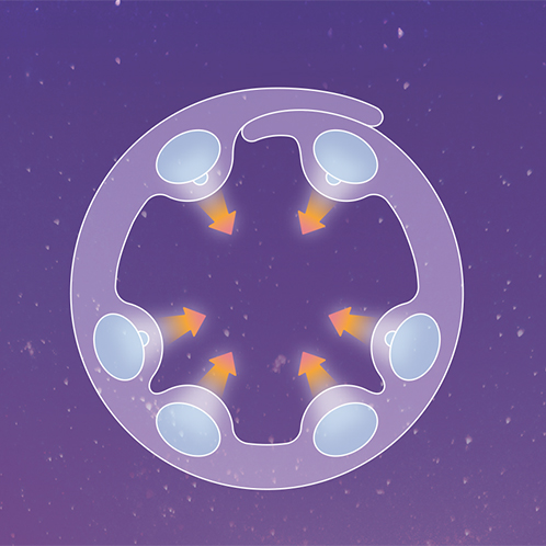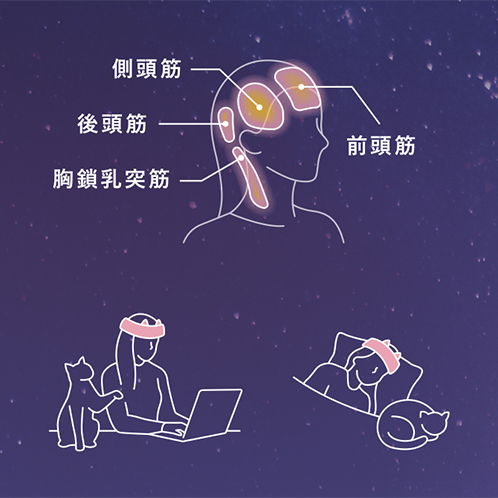 6つのエアバッグが前頭筋、側頭筋、後頭筋をやさしく刺激。前頭部には面で当たるエアバッグ、側頭部と後頭部には柔らかい突起付きのエアバッグが配置され、部位ごとに心地よい刺激が得られます。