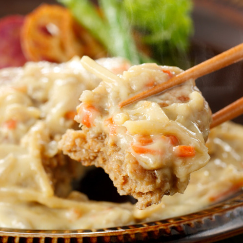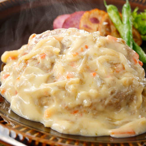 しっかりとした肉感があり、ふっくらとジューシーなハンバーグを白味噌仕立ての味わいに仕上げた一品。
