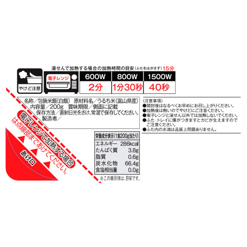 丁寧に育てられた、日本有数の米どころ富山県入善(にゅうぜん)のお米に限定し、“名水百選”に選ばれた黒部川扇状地湧水群(ゆうすいぐん)の伏流水が湧き出る土地で、そのおいしい水を使用し、メーカー独自の技術でふんわりと炊き上げたパックごはんをご紹介します。入善のお米を、入善で汲み上げられた黒部川の湧水で炊き上げた、ふっくらとした食感と色つやを楽しめるこだわりの逸品。電子レンジで温めるだけで、すぐにおいしい炊き立てのごはんの味わいをお楽しみいただけます。さらに、冷めてもおいしく食べられます。