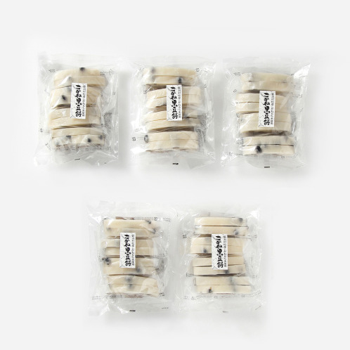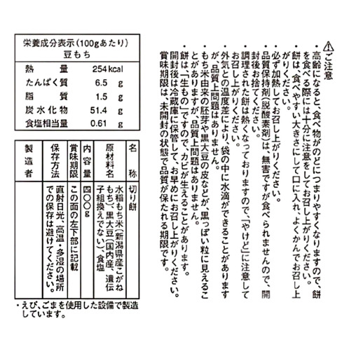 もち米は、餅の要であるコシに優れた、こがねもち品種に限定。米どころ新潟の中でも、産地を新潟県五泉市村松地区に限定し、地元農家などの協力により育てられたもち米を使用しています。黒豆は、北海道産の風味豊かなものに限定して使用し、旨みがある沖縄県で製造した塩をまぶし自家焙煎しました。焙ることで旨みが増した黒豆を餅の中に練り込み、もち米と黒豆、2つのおいしさを同時に味わえるように仕上げています。良質な米を独自の杵つき製法でつき上げてからすぐに冷やすことで、昔ながらの味わいに仕上げた逸品です。