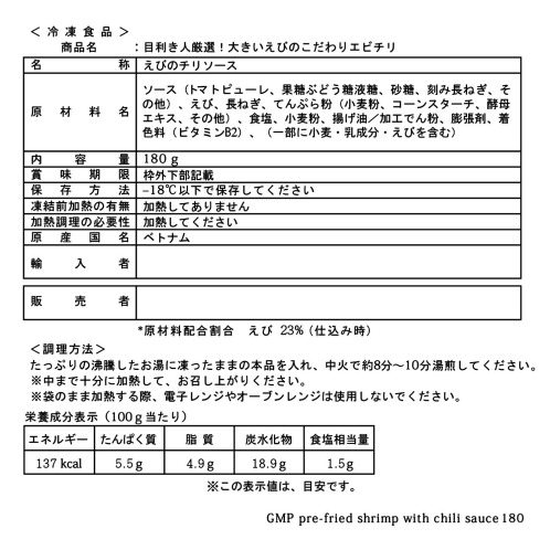 大きめサイズの海老を使用した、食べ応えのあるエビチリ。魚を見続けて20年以上の目利き人が、水産業界の人脈を駆使することで完成した逸品です。海老の一大産地として知られるベトナムのバナメイ海老を使用。タレと絡んだ時に海老のおいしさや食感をたっぷり感じられるよう、大豆油でカリッと揚げました。トマトピューレをベースに、にんにく、生姜、がらスープ、調味料と香辛料を数種類ブレンドし、適度な酸味・辛味の中にも深みのある味わいを引き出しました。活の海老から製品になるまで凍結せずに製造し、ワンフローズンでお届け。ボリュームたっぷりに仕上げました。
