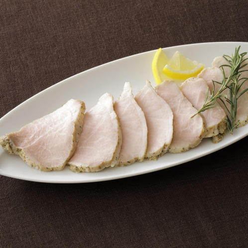 国産豚もも肉を爽やかなハーブソルトで風味豊かに仕上げました。オーブンで表面を香ばしく焼き、その後じっくりと加熱することで、驚くほどしっとりジューシーな食感が楽しめます。スライスすると中は美しい薄ピンク色でやわらかく、食べやすい逸品です。