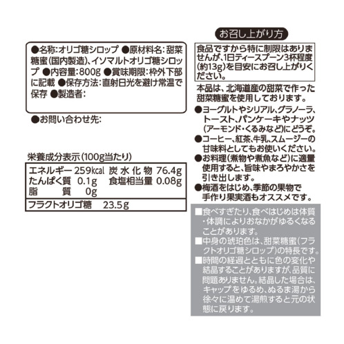 「おいしく毎日摂りたい オリゴ糖シロップ」のご紹介です。本商品は、入手困難で希少な北海道特産の甜菜(砂糖大根)を原料とした甜菜糖蜜(フラクトオリゴ糖シロップ)と、イソマルトオリゴ糖シロップをブレンドし、豊かな味わいがありながらも健康にこだわった逸品です。オリゴ糖を普段から健康のために召し上がっている方にはもちろん、毎日の健康を維持したい方にもうれしいサイズ。使いやすい容器なので、毎日のお食事にたっぷりとご家族でお召し上がりいただけます。また、シロップとしてお料理にもお使いいただけます。※ティースプーン3杯(約13g)で甜菜糖蜜に含まれるフラクトオリゴ糖3gが摂取できます