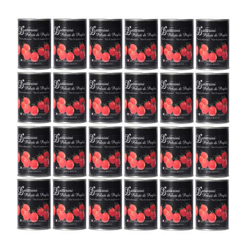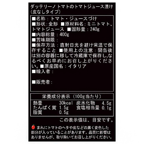 イタリア南部のトマト生産の中心地であるプーリア州で収穫した新鮮なミニトマトの皮を剥き、自家製のトマトジュースに漬けた缶詰をご紹介。ミニトマトの中でも特に味が濃厚で希少な“ダッテリーノ種”に限定し、さらに皮を剥いてトマトジュース漬けにした特別な缶詰です。パスタ料理やスープの具材としても重宝し、トマト煮込みやカレーライスの味わいの決め手としても活躍します。