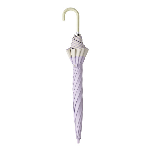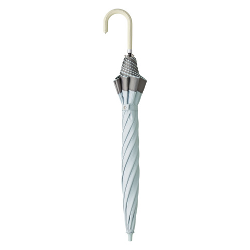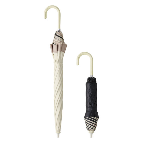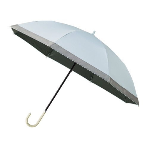 軽量で丈夫なグラスファイバー素材を使用した8本骨構造。デザイン面では上品な光沢のあるグログラン生地をアクセントにしたバイカラー仕様で、高級感のある仕上がりに。ハンドル部分には合皮を巻き、細めのデザインで華奢な印象を与えます。
