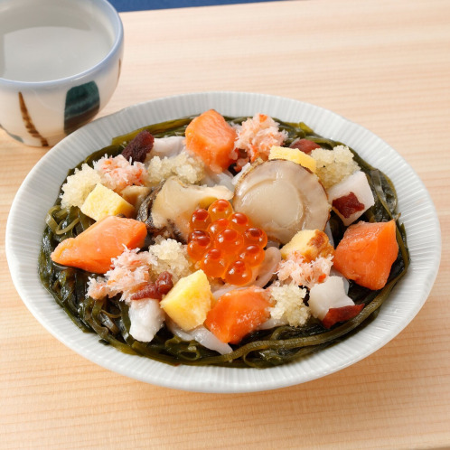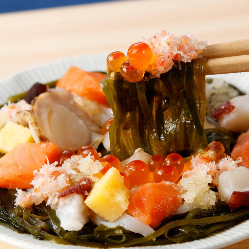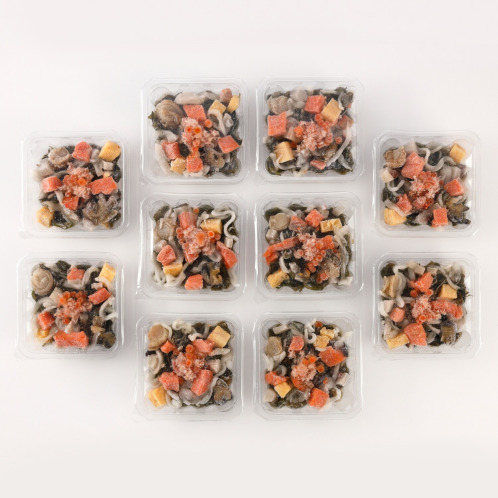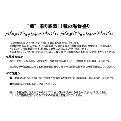 北海道の素材を、手間を惜しまず調理した料理を提供する、札幌市にある名店“蔵”が物産展で販売する“海鮮重”からヒントを得て作り上げた、11種の海鮮を使用した「“蔵”彩り豪華11種の海鮮盛り」のご紹介です。3種類の昆布に、かに、いくら醤油漬け、帆立、サーモン、たこ、いか、数の子、つぶ貝と、厳選した11種の海鮮と厚焼き玉子の計12種の具材を使用。一口ごとにそれぞれの素材の特長ある味わい・食感を楽しめます。また、海鮮の旨みが調和したやさしい醤油ベースの味わいです。そのままはもちろん、ご飯にかけたり、麺類に絡ませたりと、さまざまにお楽しみいただけます。